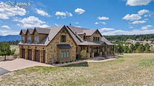 Experience Colorado living at its finest in this stunning custom estate, set on 8+ private acres, showcasing truly breathtaking mountain views. Designed with exceptional craftsmanship & attention to detail, the main level features wide-plank Georgia Pine Hardwood floors, a soaring great room with a dramatic double-sided gas stone fireplace, & rich architectural elements including wood beams, alder trim, & custom frame-and-panel finishes throughout. The executive office with built-ins & a formal dining room, create an ideal setting for both work & entertaining. At the heart of the home, the gourmet kitchen impresses with cherry cabinetry, granite countertops, a premium Wolf Range with custom hood, dual Bosch stainless steel dishwashers, a spacious pantry, and a cozy sitting area. This home offers incredible versatility with a massive upper-level loft above the garage, perfect for a 7th bedroom, another family room, rec room, or creative space. The luxurious primary suite is a true retreat, complete with a spa-inspired bathroom & radiant floor heating. The walk-out basement features a second kitchen/wet bar, theater room (currently used as an exercise room), a 4th fireplace, & direct access to the lower-level garage. Car enthusiasts will appreciate the rare 5-car garage setup, with a 3-car upper garage & 2-car lower garage. Outdoor living is just as impressive, with an expansive upper deck & lower patio, ideal for gatherings while taking in the panoramic views. Additional features include multi-zone climate control, Class 4 Slate roof, dual A/C systems, a 6-person hot tub, central audio/media system, radon mitigation, central vacuum, generator wiring, Trex deck stairs, built-in grill, outdoor stone fireplace (gas), & a private yard with mature trees & basketball court. Zoned for horses & complete with a loafing shed, this property offers the perfect blend of luxury, comfort, & Colorado lifestyle. Located within the highly sought-after District 20 schools.