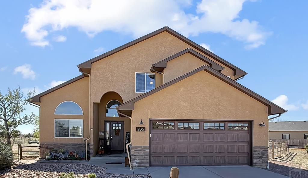 What a rare find! Come see this gorgeous horse property, located on 2.57 acres in Pueblo West. As you enter the home, notice the sun-drenched rooms and vaulted ceilings. The main level features 2 living spaces, both located conveniently off the kitchen, perfect for family time or entertaining. Walk outside to the open patio and relax in your fenced private back yard. Upstairs you will discover an opulent primary suite, complete with a 5 piece bath, and there are 2 additional bedrooms with a shared full bath. The fully finished basement offers yet another living space, 2 more bedrooms, and another full bath. Located on a huge corner lot, your horses will love their barn and the freedom that comes with all that acreage. This is truly a home to enjoy for a lifetime!
