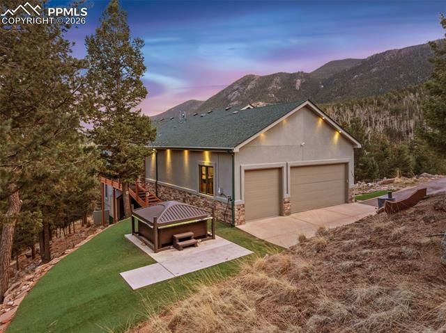 Experience refined mountain living in the exclusive, gated community of Crystal Park, where privacy, elevation, and breathtaking natural beauty converge. Perfectly positioned to capture sweeping views from nearly every window, this exceptional ranch-style residence offers a rare combination of comfort, sophistication, and serene Colorado mountain lifestyle. Thoughtfully designed for main-level living, the home features a spacious primary suite and a dedicated office that can easily serve as an additional bedroom. The kitchen blends functionality with quality, showcasing rich cherry cabinetry, granite countertops, double ovens, and stainless steel appliances. An inviting dining area framed by a bay window captures stunning vistas and flows seamlessly into the great room, where custom built-ins and a gas fireplace create a cozy gathering space. Step outside to the expansive decks and patios, ideal for morning coffee, evening sunsets-all surrounded by the quiet beauty of the mountains. The walk-out lower level offers two additional bedrooms, a 3/4 bath, and a spacious additional living room. A large flex space provides room for storage and/or a home gym and includes a dry sauna perfect to enjoy with the included hot tub. Additional highlights include maple flooring, radiant heat in the bathrooms, a heated and oversized 3-car garage, and a paved driveway. Serviced by well, septic, and propane, the home delivers modern convenience paired with mountain independence. Residents of Crystal Park enjoy a stocked trout pond, miles of scenic trails with direct access to BLM land, a community center with pool and pickleball courts, a staffed entrance gate, private fire department, and meticulously maintained roads year-round. Located in Manitou Springs—a vibrant and highly sought-after mountain town known for its charm, dining, and outdoor recreation—this property offers a rare opportunity to enjoy both seclusion and convenience, with Colorado Springs just a short drive away.