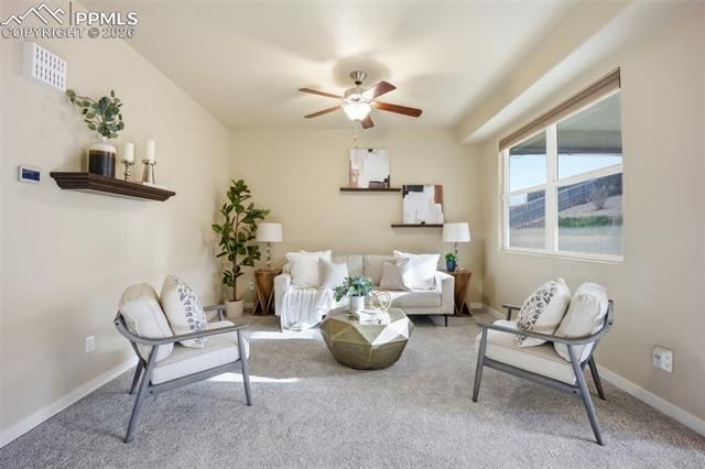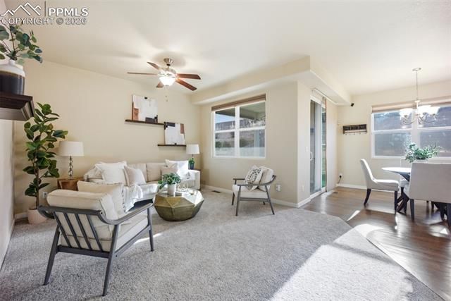 Welcome home to this bright, open, and thoughtfully designed two story home. From the moment you step inside, you are greeted by an airy foyer and a versatile front flex space, perfect for a home office or welcoming sitting area, complete with a stylish barn door for added character. The main level is anchored by a beautifully appointed kitchen featuring granite countertops, a center island, stainless steel appliances, and warm hardwood flooring that flows seamlessly into the living area, creating an ideal space for both everyday living and entertaining. Upstairs, the spacious primary suite offers a true retreat with a five piece bath and the added convenience of direct access to the laundry room, bringing ease and efficiency to your daily routine. Brand new carpet throughout enhances the fresh, move in ready feel. The finished basement expands your living space with durable LVP flooring, perfect for a second living area, home gym, or recreation space. Step outside to a covered patio and spacious lot, offering plenty of room to relax or entertain under the Colorado sky. Additional features include a reverse osmosis water filtration system, trim exterior lighting, and a class 4 impact resistant roof for added value and peace of mind. Located in The Glen at Widefield, this home offers a clean, functional layout with the perfect balance of comfort, flexibility, and thoughtful upgrades.