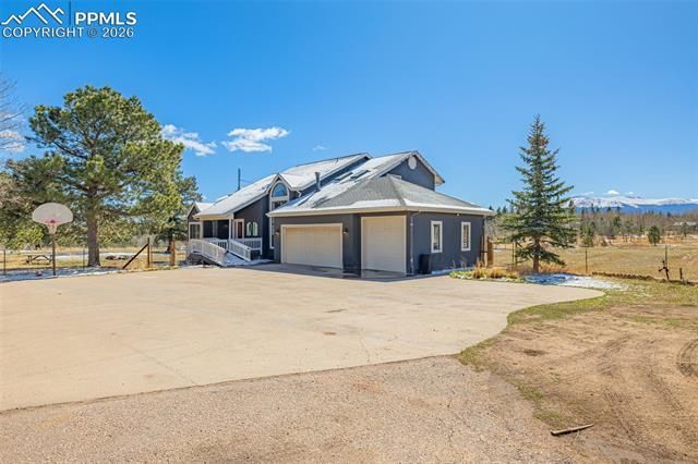 Nestled on 4 usable acres in Divide, this 4,014 sq ft home offers space, functionality, and stunning unobstructed views of Pikes Peak. Located just 10 miles from Woodland Park and near National Forest and public land, enjoy easy access to endless outdoor recreation. Warm finishes throughout include knotty alder doors and trim, wrought iron railing accents and new carpet throughout. The upper level features a private primary suite with Juliet balcony, three additional bedrooms and a full bath. The main level offers a formal dining room, spacious kitchen with eat-in area and walk out, living room, office/flex space, and a conveniently located laundry area off the attached 3-car garage. The lower level includes two generously sized bedrooms, a full bath, utility room, and a large living/den space with wet bar—ideal for entertaining or multi-generational living. With flat, highly usable land and room to expand, this property delivers the best of Colorado mountain living with space, privacy, and versatility.