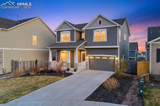 Don't miss this gorgeous Challenger Homes Manchester floorplan in Sterling Ranch, zoned to Academy School District 20 & boasting unobstructed Pikes Peak views and incredible outdoor living spaces. This beautifully updated home offers luxurious living, serene mountain views, and easy access to D20 schools, parks, trails, and military bases. As you walk into the home, you will see a well-appointed home office off of the entry, as well as a half bath. Continue into the home and experience the open concept living room/dining area/kitchen, perfect for entertaining, or everyday living. The updated kitchen is a true showstopper, featuring new chic two-tone cabinetry (all soft close), new hardware, and stunning granite countertops. Don't miss the large island, generous kitchen pantry, and all stainless-steel appliances. The family room features a gas fireplace, perfect for cozying up on cold winter nights. Head outside onto the deck that is ideal for summer barbeques and morning coffee routines, all while taking in breathtaking mountain views. Continue upstairs, and step into the generous loft, ideal for a playroom, second living space, or even a second home office. Continue into the primary suite, which includes a 5-piece spa-like bath with soaking tub, dual vanities, large shower, and a walk-in closet. The two additional bedrooms upstairs are generously sized, both featuring walk in closets. An upstairs laundry room and a full bathroom complete the upper level. Downstairs in the garden level basement, you will find a fourth bedroom, full bathroom, and oversized rec room. Central A/C and designer upgrades throughout (including newer LVP flooring throughout the main level) complete this exceptional home—Close to Powers Blvd, Peterson SFB, and USAFA. Near the Section 16 Trailhead, The Pineries Open Space, and Black Forest Regional Park. Schedule your private tour today and experience the best of Colorado living!