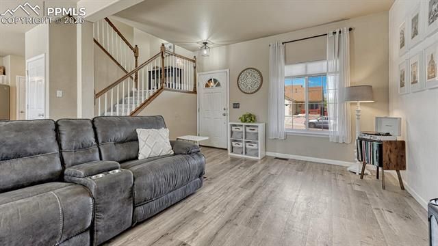 Beautifully maintained and move-in ready, this inviting home offers a thoughtful blend of comfort, style, and functionality. Ideally located with convenient access to shopping, dining, and everyday amenities. The main level showcases luxury vinyl plank flooring, paired with a contemporary, updated kitchen designed for both everyday living and entertaining. The open-concept layout flows seamlessly into the living area, highlighted by a custom fireplace and mantle that creates a warm, stylish focal point. Upstairs, the spacious primary suite features generous closet space and a beautifully updated, oversized en-suite bathroom designed for comfort and relaxation. Two additional bedrooms offer flexible living options, complemented by ample storage and well-sized closets throughout the home. Newer carpet on upper and basement levels. The finished basement expands the living space with a large media or recreation area, an additional bedroom, and a full bathroom. Step outside to enjoy the fully fenced backyard, complete with low-maintenance turf, creating an ideal setting for outdoor enjoyment with minimal upkeep. Central air conditioning adds year-round comfort. Close to Fort Carson, Schriever AFB, and Peterson AFB. Easy access to Powers Corridor and I-25. This well-cared-for home offers a balance of modern updates and practical living—ready for its next owner to enjoy.