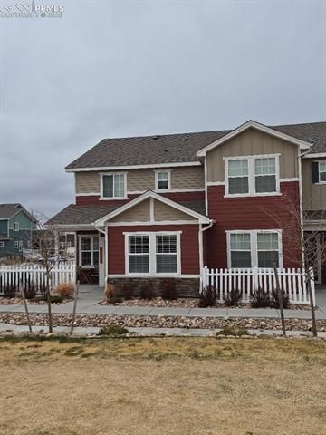This beautiful townhome in Wolf Ranch is located in one of the most desirable neighborhoods in Colorado Springs and features so many upgrades! It is on a perfectly situated corner lot, with easy access to guest parking, mailbox and pet station. Kitchen features large center island with quartz countertops, pendant lighting and beautiful stainless-steel appliances. Open and airy great room concept. Plantation shutters throughout the main level and bull nose corners throughout. The half-bath is conveniently located just as you walk in from the garage. Comfort level toilets. Nice storage capacity under stairway. Open rail stairway to the upper level where you will find a nice master suite with walk-in closet, attached bath with dual sinks and large shower with bench. Two additional bedrooms (one with a walk-in closet), a full bath and laundry room complete the upper level. The cabinetry in the laundry is a nice upgrade and the washer and dryer (with pedestals are included)! Covered front porch to enjoy your morning coffee or to relax in the evening. This home also has central air conditioning for your comfort during the hot summer months. All this plus coveted School District 20 schools. Easy access to Powers corridor and 1-25. Come take a look!