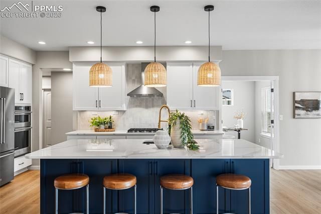 Welcome to the kind of home where memories are made, from backyard games on a sunny afternoon to cozy nights by the fire. This two-year-old Toll Brothers home sits on one of the largest lots in Wolf Ranch, offering rare space to spread out, play, and truly enjoy Colorado living. Imagine kids and pets running freely in the fully fenced yard while you relax by the fire pit or unwind in the hot tub. The covered deck is perfect for weekend barbecues, morning coffee, or simply taking in the open space around you. Inside, the main level is designed for connection. The great room brings everyone together with a stacked stone fireplace and floor-to-ceiling glass sliding doors that extends outdoor living to the covered deck. The gourmet kitchen, featuring quartz counters, upgraded stainless appliances, and designer lighting, becomes the heart of the home, making everyday living easier and more enjoyable. The main level also offers a private primary suite, an additional ensuite bedroom, and a dedicated office, giving flexibility for guests, work, or multi generational living. Downstairs is where the fun continues with a home theater, wet bar, game area, two additional bedrooms sharing a Jack and Jill bath, and walkout access that makes indoor/outdoor living seamless. Living in Wolf Ranch means more than just a beautiful home. Enjoy a private lake for fishing, a community pool for summer days, concerts in the park, and a new clubhouse coming soon, creating even more ways to connect and enjoy the neighborhood. With abundant upgrades throughout and an oversized three car garage, this home combines comfort, space, and function. Located in award winning Academy District 20, this is a home and community that truly fits a busy, active family.